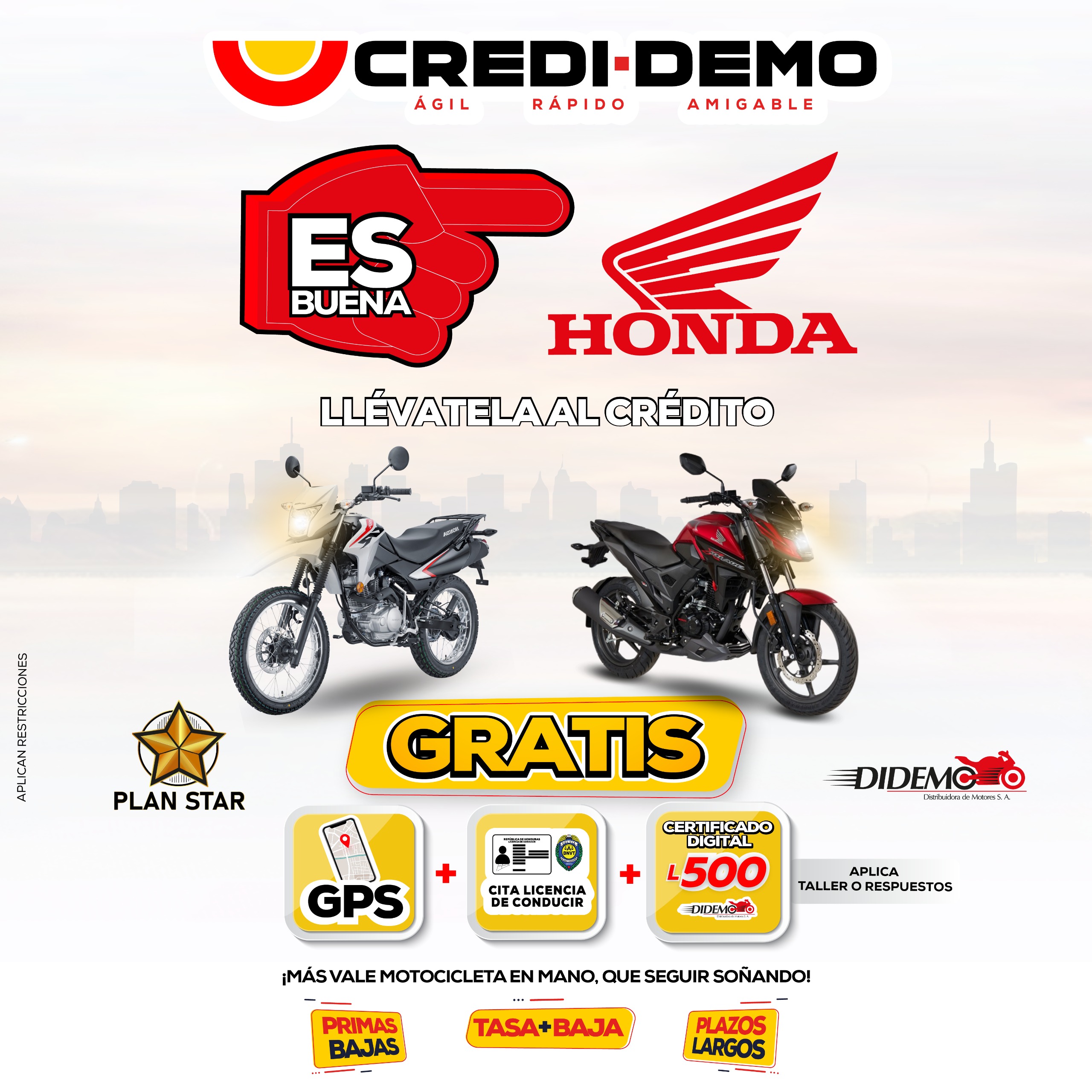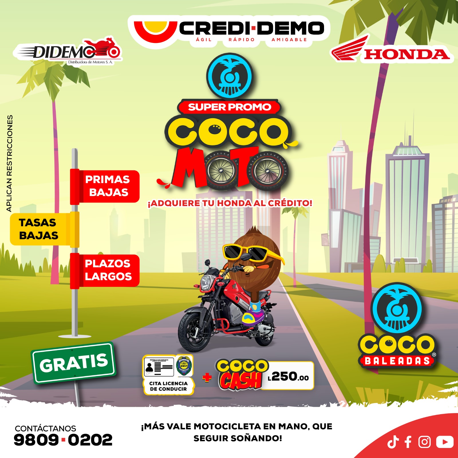 CREDIDEMO y COCO BALEADAS traen una oferta irresistible para que te lleves tu moto HONDA al crédito con primas desde L1000 y las mejores condiciones del mercado. ¡Y lo mejor de todo! Recibes 2 GRANDES PREMIOS GRATIS:
